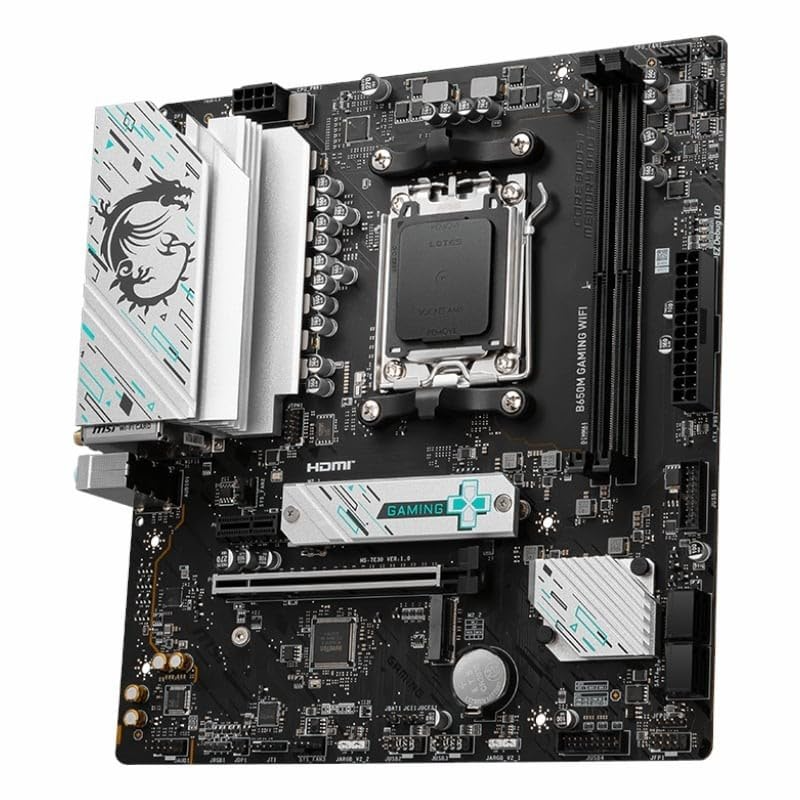 The MSI B650M Gaming WiFi is a powerful micro-ATX motherboard tailored for AMD Ryzen 7000, 8000, and 9000 series processors on the AM5 platform. It supports cutting-edge DDR5 memory, PCIe 4.0 for lightning-fast graphics and storage, and features dual M.2 slots for high-speed SSDs. With built-in Wi-Fi 6E and 2.5G LAN, it ensures top-tier connectivity for gamers and creators alike. The motherboard also includes high-definition audio, extensive USB connectivity, and support for addressable RGB, offering both performance and customization in a compact form factor.